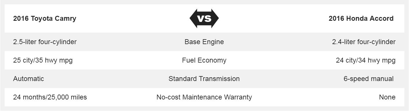 When comparing the list of standard convenience features, these rivals aren't all that close. Voice activated controls, 6-speaker audio system, driver multi-adjustable power seat, heated exterior mirror, one-touch passenger power window, and a rear split folding bench seat, are all features that are standard on the 2016 Toyota Camry - but not on the 2016 Accord. While you could upgrade the Accord to get all or most of those features, it would cost you thousands more than if you had opted for America's best-selling mid-size sedan, the Toyota Camry. Another advantage of the 2016 Camry is its' outstanding no cost maintenance plan, which is good for 2 years of 25,000 miles, whichever comes first. Additionally, 24-hour roadside assistance is included for 2 years, regardless of mileage.