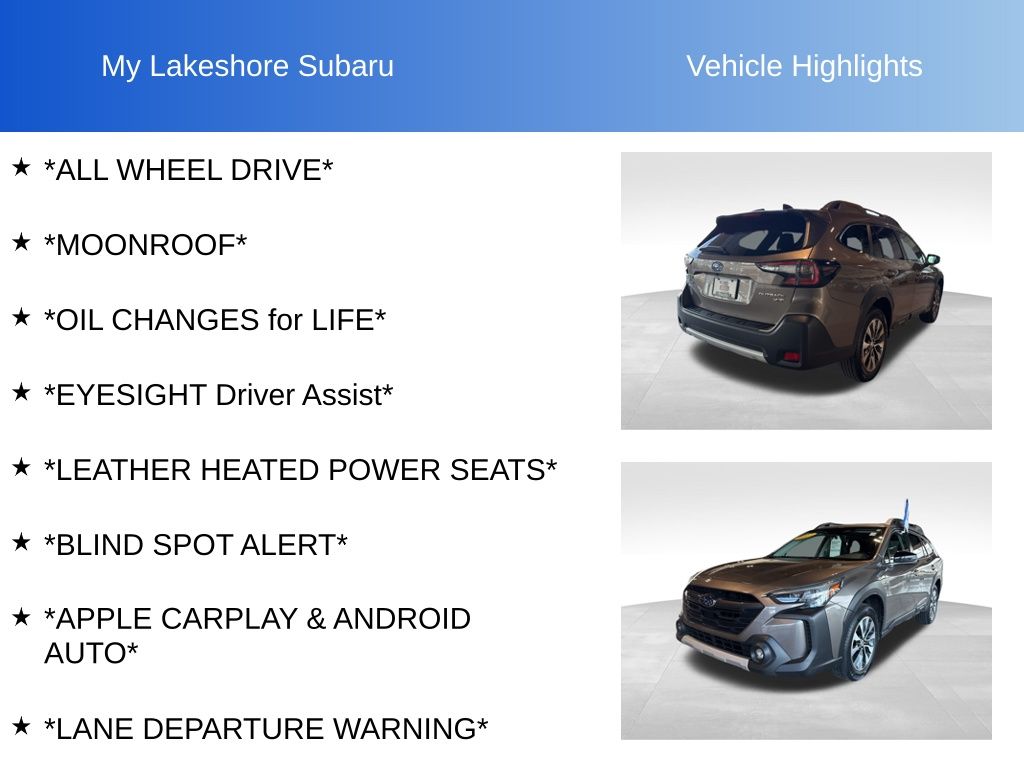 Outback Limited XT, Brilliant Bronze Metallic, *ALL WHEEL DRIVE*, *APPLE CARPLAY & ANDROID AUTO*, *BLIND SPOT ALERT*, *EYESIGHT Driver Assist*, *LANE DEPARTURE WARNING*, *LEATHER HEATED POWER SEATS*, *LOCAL TRADE*, *MOONROOF*, *OIL CHANGES for LIFE*. Certified. Brilliant Bronze Metallic 2023 Subaru Outback Limited XT AWD CVT Lineartronic 2.4L DOHC