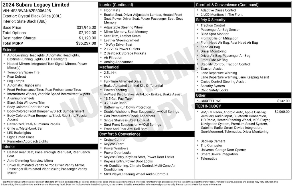 Legacy Limited, Crystal Black Silica, *ALL WHEEL DRIVE*, *APPLE CARPLAY & ANDROID AUTO*, *BLIND SPOT ALERT*, *BLIND SPOT MONITORING*, *EYESIGHT Driver Assist*, *HEATED STEERING WHEEL*, *LANE DEPARTURE WARNING*, *LEATHER HEATED POWER SEATS*, *MOONROOF*, *OIL CHANGES for LIFE*, 360 Degrees Heated Steering Wheel, Driver Monitoring System (DMS)/DriverFocus, Moonroof & Nav & Heated Steering Whl & DriverFocus, Power Moonroof, Radio: Subaru STARLINK 11.6" Multimedia Nav System. Certified. Crystal Black Silica 2024 Subaru Legacy Limited AWD Lineartronic CVT 2.5L 4-Cylinder DOHC 16V