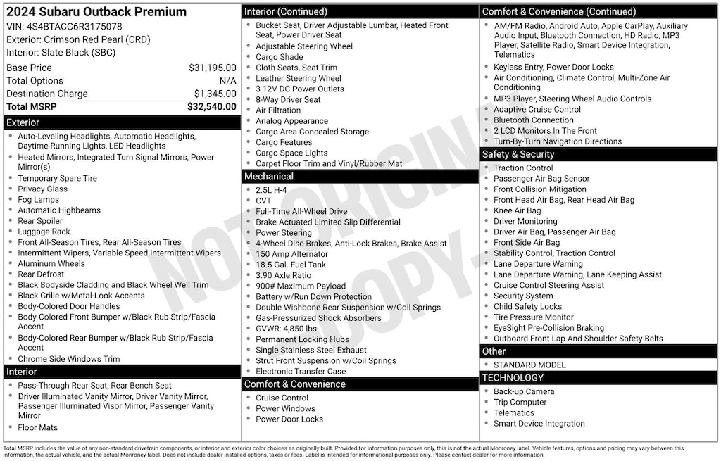 Outback Premium, Crimson Red Pearl, *ALL WHEEL DRIVE*, *APPLE CARPLAY & ANDROID AUTO*, *EYESIGHT Driver Assist*, *HEATED SEATS*, *LANE DEPARTURE WARNING*, *OIL CHANGES for LIFE*. Certified. Crimson Red Pearl 2024 Subaru Outback Premium AWD CVT Lineartronic 2.5L 4-Cylinder DOHC 16V
