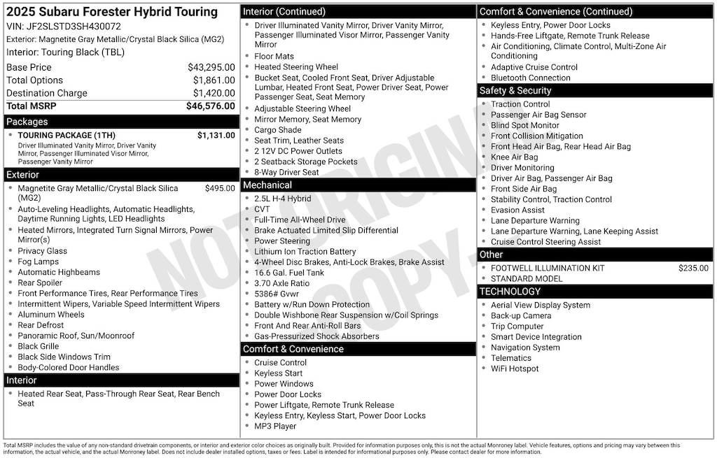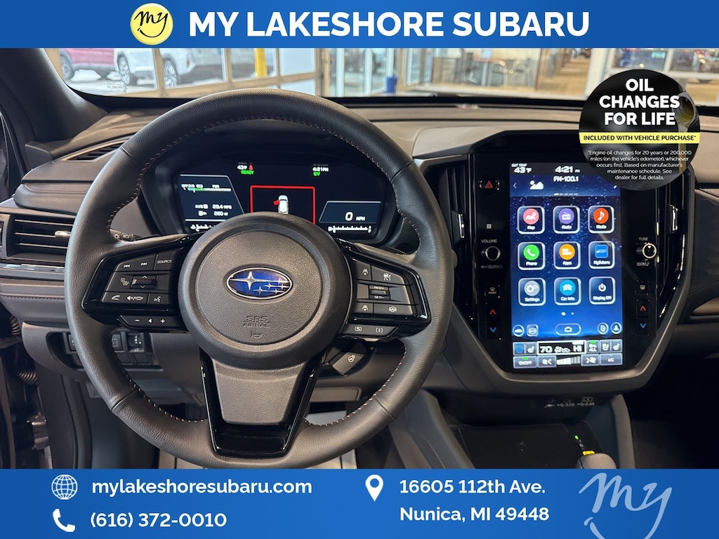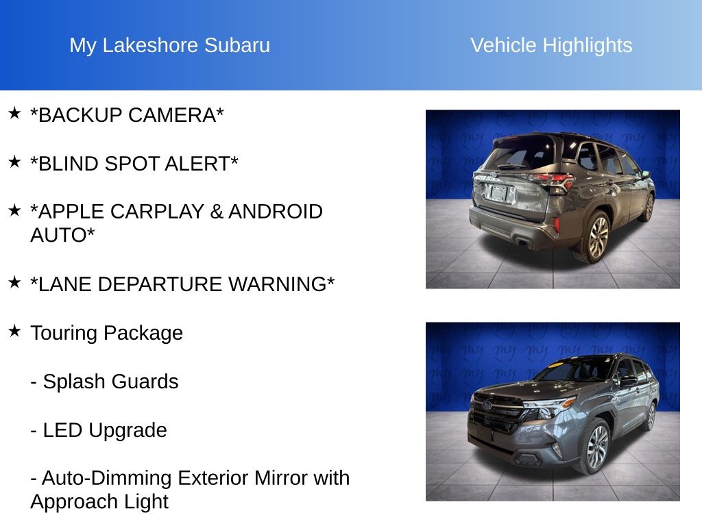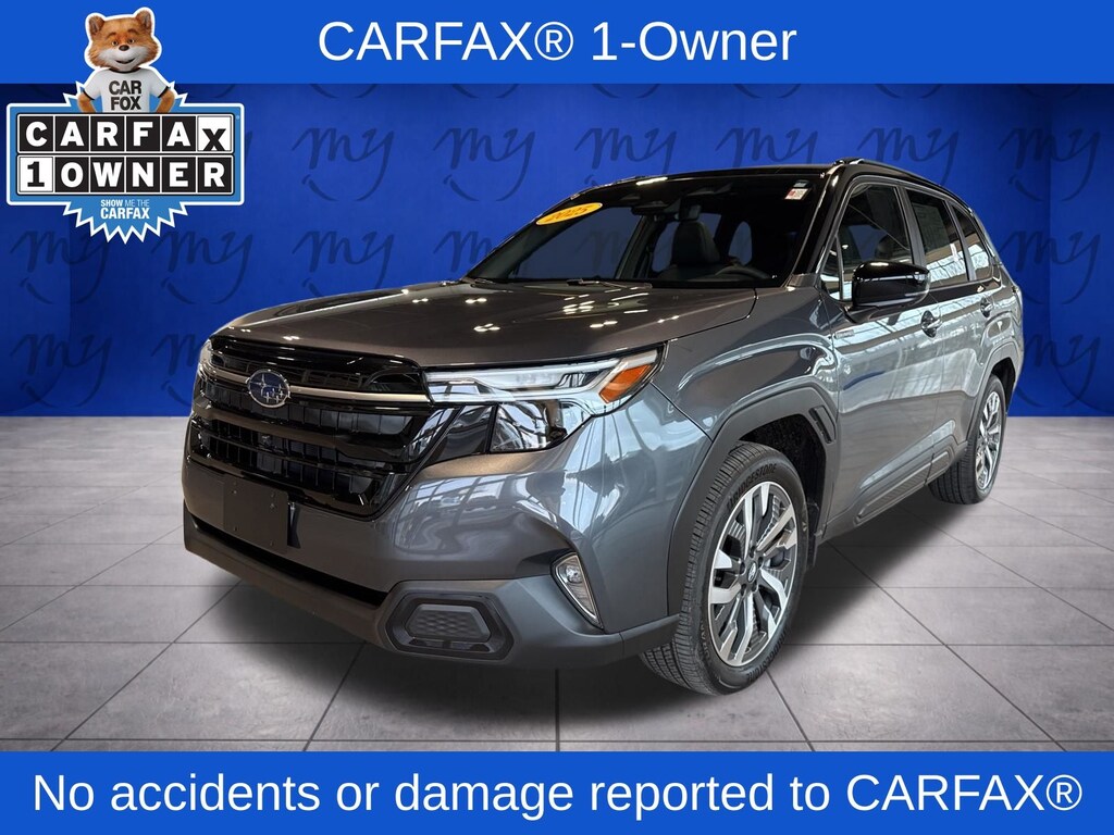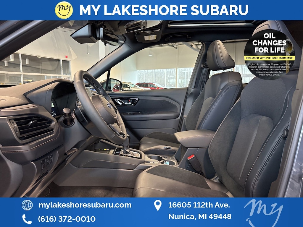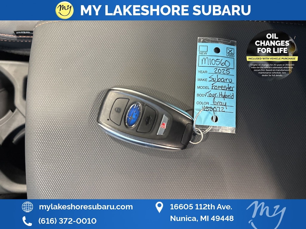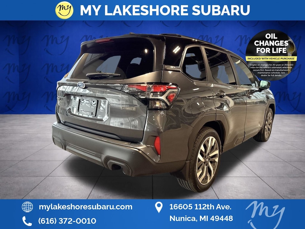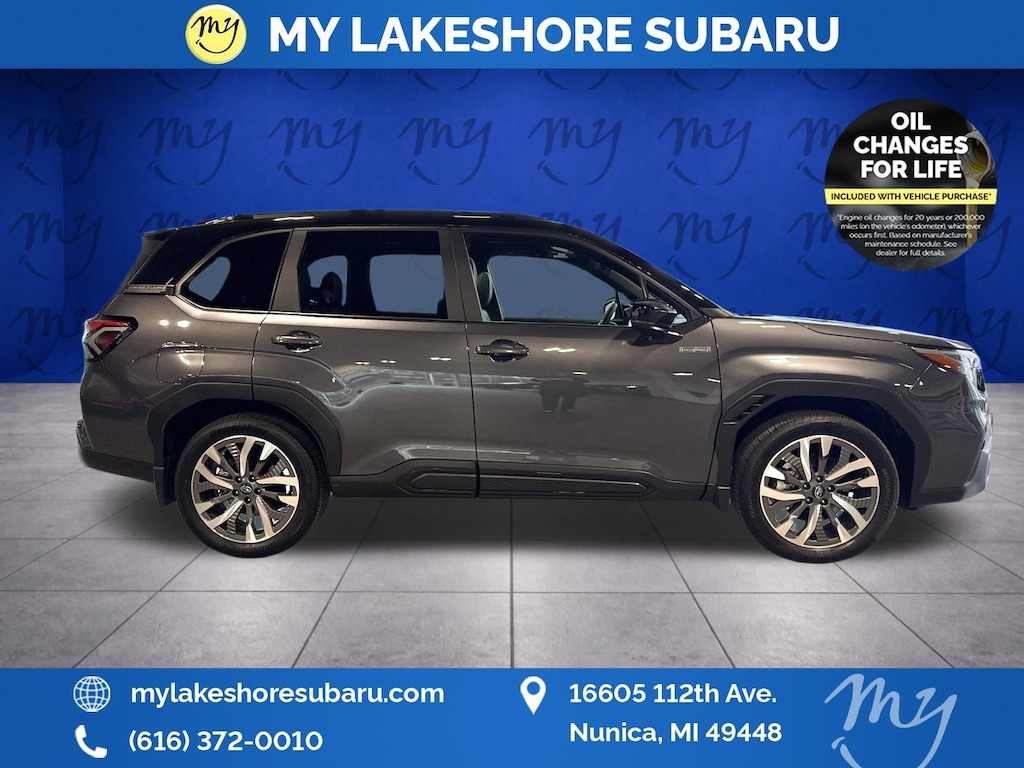 Forester Hybrid Touring, Magnetite Gray Metallic/Crystal Black Silica, *ALL WHEEL DRIVE*, *APPLE CARPLAY & ANDROID AUTO*, *BACKUP CAMERA*, *BLIND SPOT ALERT*, *BLIND SPOT MONITORING*, *EYESIGHT Driver Assist*, *HEATED REAR Seats*, *HEATED STEERING WHEEL*, *LANE DEPARTURE WARNING*, *LEATHER HEATED POWER SEATS*, *OIL CHANGES for LIFE*, *PANORAMIC MOONROOF*, All-Weather Floor Liners, Auto-Dimming Exterior Mirror with Approach Light, Body Side Molding - Crystal White Pearl, LED Upgrade, Rear Bumper Cover, Splash Guards, Touring Package. Certified. Magnetite Gray Metallic/Crystal Black Silica 2025 Subaru Forester Hybrid Touring AWD Lineartronic CVT 2.5L 4-Cylinder DOHC 16V
