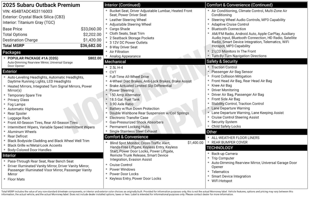 Outback Premium, Crystal Black Silica, *ALL WHEEL DRIVE*, *APPLE CARPLAY & ANDROID AUTO*, *BACKUP CAMERA*, *BLIND SPOT MONITORING*, *EYESIGHT Driver Assist*, *HEATED SEATS*, *LANE DEPARTURE WARNING*, *OIL CHANGES for LIFE*, Blind Spot Detection (BSD), BSD w/RCTA & Keyless Access & Push Button Start, Hands-Free Power Rear Gate, Keyless Access w/Push Button Start, Rear Cross Traffic Alert (RCTA). Certified. Crystal Black Silica 2025 Subaru Outback Premium AWD CVT Lineartronic 2.5L 4-Cylinder DOHC 16V