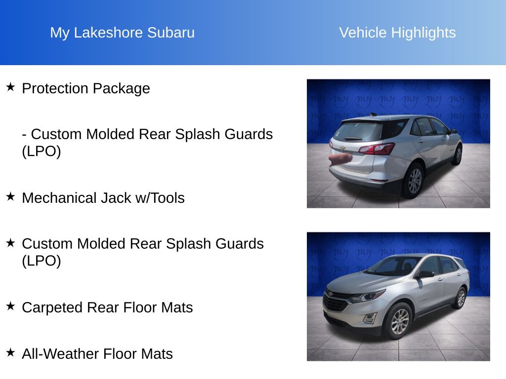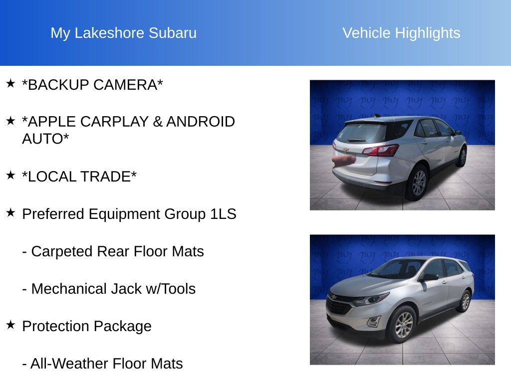 Equinox LS, Silver Ice Metallic, *APPLE CARPLAY & ANDROID AUTO*, *BACKUP CAMERA*, *LOCAL TRADE*, All-Weather Floor Mats, Carpeted Rear Floor Mats, Custom Molded Rear Splash Guards (LPO), Mechanical Jack w/Tools, Preferred Equipment Group 1LS, Protection Package. Silver Ice Metallic 2018 Chevrolet Equinox LS FWD 6-Speed Automatic Electronic with Overdrive 1.5L DOHC