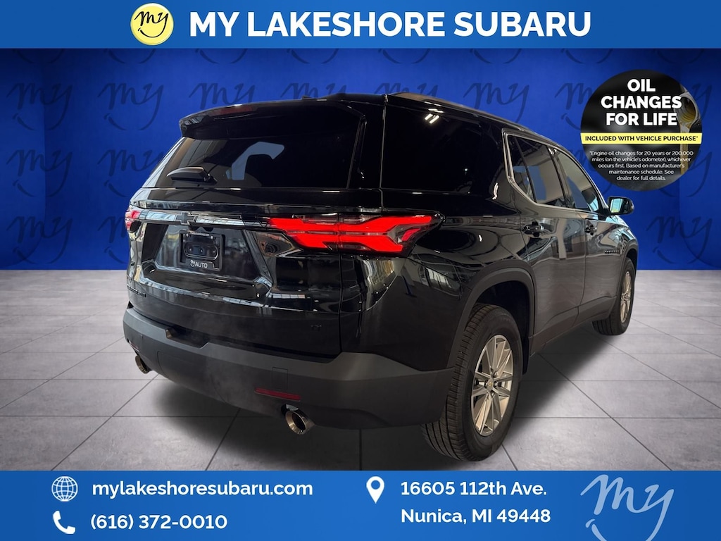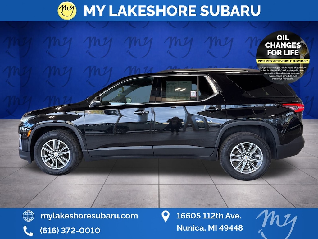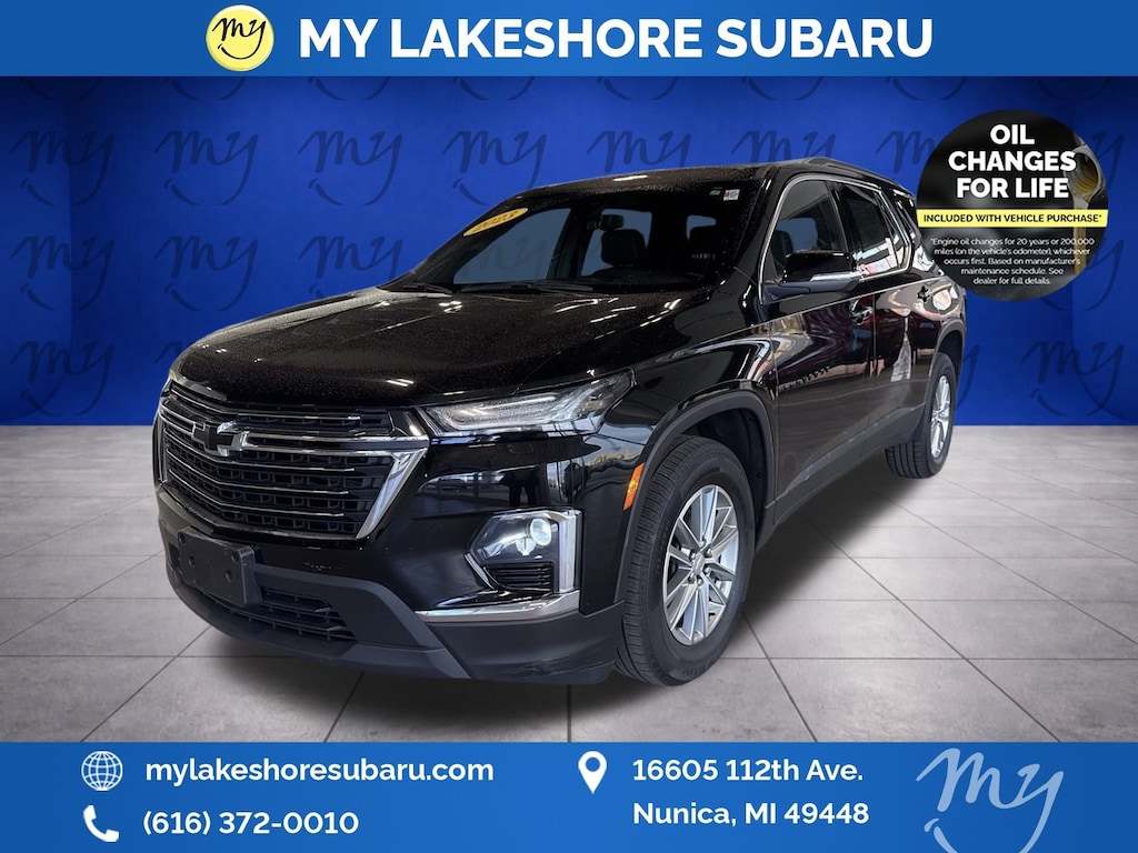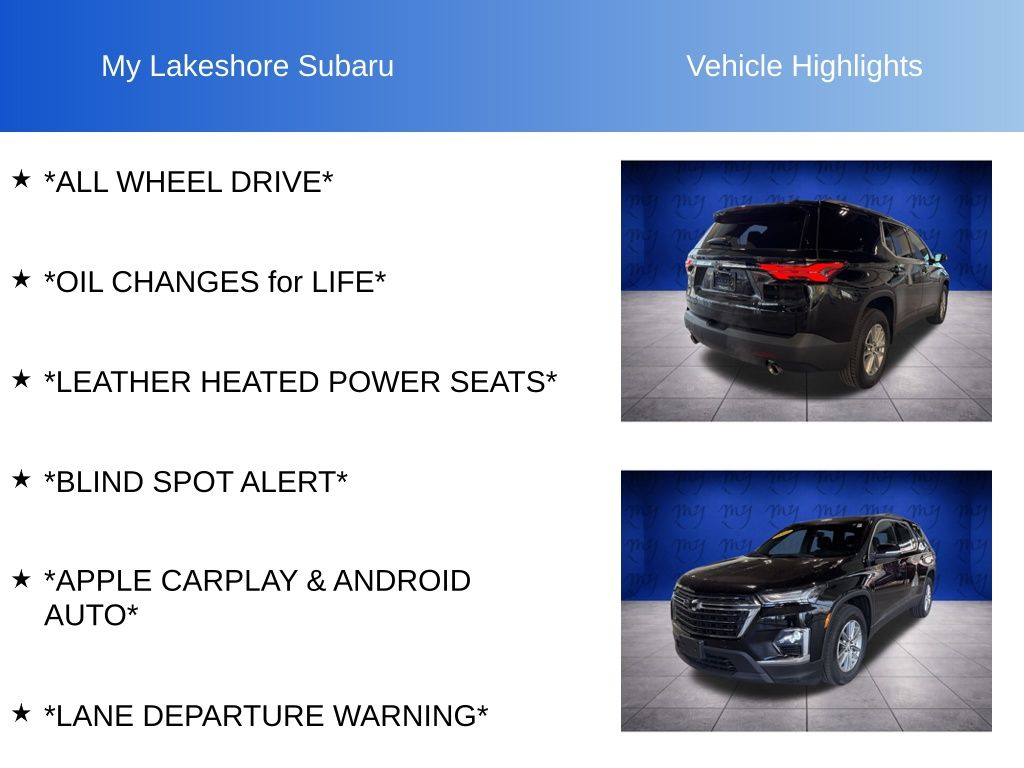 Traverse LT Leather, AWD, Mosaic Black Metallic, *ALL WHEEL DRIVE*, *APPLE CARPLAY & ANDROID AUTO*, *BLIND SPOT ALERT*, *LANE DEPARTURE WARNING*, *LEATHER HEATED POWER SEATS*, *OIL CHANGES for LIFE*. Mosaic Black Metallic 2023 Chevrolet Traverse LT Leather AWD 9-Speed Automatic 3.6L V6 SIDI VVT