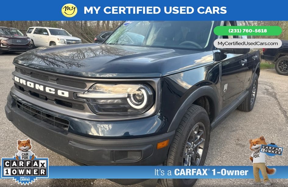MY Certified Used Cars of Muskegon is your #1 choice in Michigan to get the BEST PRICE on used vehicles and BEST value for your trade. The MY Certified Used Cars team is ready to provide you with a world-class experience, ensuring that you find the perfect vehicle that fits all your needs. Every vehicle has been through a full safety inspection completed by certified technicians and fully detailed. We sell many makes and models, Pre-Owned Vehicles with years from 2025-2024-2023-2022-2021-2020-2019-2018-2017-2016-2015-2014-2013-2012-2011-2010-2009-2008-2007 and all makes Audi, BMW, Chevrolet, Nissan, Toyota, Volkswagen, Kia, Hyundai, Mercedes, Dodge, Chrysler, Jeep, Ram, Lincoln, Honda, Subaru, and many models like Bronco, Bronco Sport, Edge, Escapes, Expedition, Explorer, Fusions, Focus, Flex, F-150 Series, F-250, F-350, Super Duty Diesel Trucks, Maverick, Altima, RAV4, 4 Runner, Mustang, Ranger, Transit, Wrangler, Grand Cherokee, Grand Cherokee L, Wagoneer, Gladiator, Grand Caravan, RAM, RAM HEMI, and more. Take advantage of our VIP experience by calling 231-760-5618 to schedule a test drive. Read our customer reviews at www.mycertifiedusedcars.com/testimonials or view our entire selection of preowned vehicles at www.mycertifiedusedcars.com, or stop by today, located at 3692 Airline Rd. Muskegon, MI 49444. CARFAX One-Owner. Blue Metallic 2022 Ford Bronco Sport Big Bend 4WD 8-Speed Automatic 1.5L EcoBoost