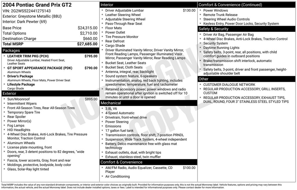 Graystone Metallic 2004 Pontiac Grand Prix GT2 FWD 4-Speed Automatic with Overdrive 3.8L V6 SFI Series III