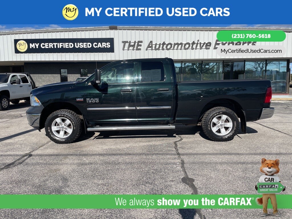 *BLUETOOTH*, *REARVIEW CAMERA*, *SUPER BUY*, *VERY CLEAN*, 1-Year SiriusXM Radio Service, 40/20/40 Split Bench Seat, Cloth 40/20/40 Bench Seat, For More Info, Call 800-643-2112, Front Armrest w/3 Cupholders, No Satellite Coverage w/AK/HI, Popular Equipment Group, Protection Group, Rear Folding Seat, Remote Keyless Entry w/All-Secure, SIRIUSXM Satellite Radio, Tow Hooks. MY Certified Used Cars of Muskegon is your #1 choice in Michigan to get the BEST PRICE on used vehicles and BEST value for your trade. The MY Certified Used Cars team is ready to provide you with a world-class experience, ensuring that you find the perfect vehicle that fits all your needs. Every vehicle has been through a full safety inspection completed by certified technicians and fully detailed. We sell many makes and models, Pre-Owned Vehicles with years from 2025-2024-2023-2022-2021-2020-2019-2018-2017-2016-2015-2014-2013-2012-2011-2010-2009-2008-2007 and all makes Audi, BMW, Chevrolet, Toyota, Volkswagen, Kia, Hyundai, Mercedes, Dodge, Chrysler, Jeep, Ram, Lincoln, Honda, Subaru, and many models like Bronco, Bronco Sport, Edge, Escapes, Expedition, Explorer, Fusions, Focus, Flex, F-150 Series, F-250, F-350, Super Duty Diesel Trucks, Maverick, Mustang MACH-E, Mustang, Ranger, Transit, Wrangler, Grand Cherokee, Grand Cherokee L, Wagoneer, Gladiator, Grand Caravan, RAM, RAM HEMI, and more. Take advantage of our VIP experience by calling 231-760-5618 to schedule a test drive. Read our customer reviews at www.mycertifiedusedcars.com/testimonials or view our entire selection of preowned vehicles at www.mycertifiedusedcars.com, or stop by today, located at 3692 Airline Rd. Muskegon, MI 49444. Black Forest Green Pearlcoat 2016 Ram 1500 Tradesman 4WD 8-Speed Automatic HEMI 5.7L V8 Multi Displacement VVT Clean CARFAX.