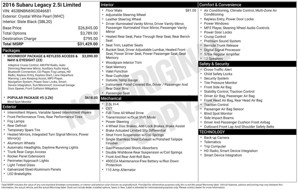 Legacy 2.5i Limited, Crystal White Pearl, *ALL WHEEL DRIVE*, *BLIND SPOT ALERT*, *EYESIGHT Driver Assist*, *HEATED REAR Seats*, *LANE DEPARTURE WARNING*, *LEATHER HEATED POWER SEATS*, *MOONROOF*. Crystal White Pearl 2016 Subaru Legacy 2.5i Limited AWD CVT Lineartronic 2.5L 4-Cylinder DOHC 16V