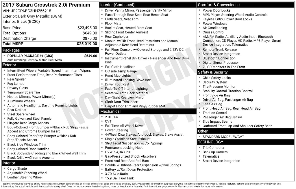 Crosstrek 2.0i Premium, Dark Gray Metallic, *ALL WHEEL DRIVE*, *BACKUP CAMERA*, *HEATED SEATS*, *LOCAL TRADE*. Dark Gray Metallic 2017 Subaru Crosstrek 2.0i Premium AWD Lineartronic CVT 2.0L 16V DOHC