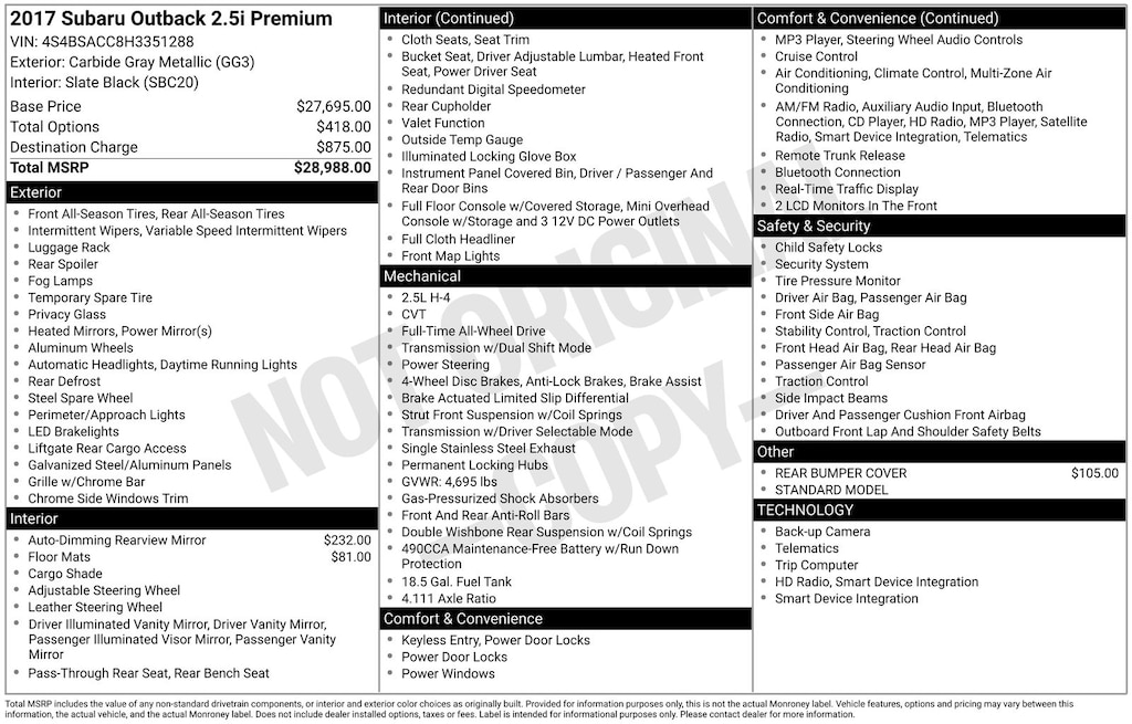 Outback 2.5i Premium, Carbide Gray Metallic, *ALL WHEEL DRIVE*, *BACKUP CAMERA*, *HEATED SEATS*, *LOCAL TRADE*. Carbide Gray Metallic 2017 Subaru Outback 2.5i Premium AWD CVT Lineartronic 2.5L 4-Cylinder DOHC 16V