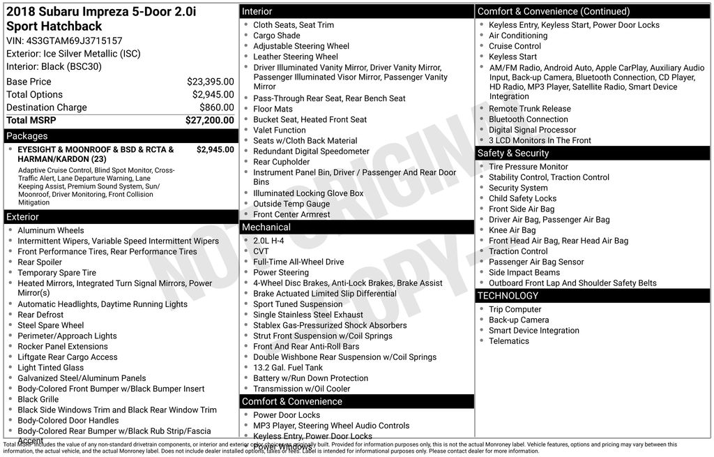 Whether you're commuting to work, embarking on a road trip, or navigating the city streets, this 2018 Subaru Impreza 2.0i Sport is the perfect companion. Experience the perfect blend of performance, technology, and style - schedule a test drive today and discover why the Impreza is the smart choice for your next vehicle.