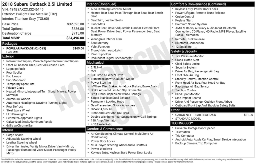 Outback 2.5i Limited, Twilight Blue Metallic, *ALL WHEEL DRIVE*, *APPLE CARPLAY & ANDROID AUTO*, *BACKUP CAMERA*, *BLIND SPOT ALERT*, *LOCAL TRADE*, *MOONROOF*, *OIL CHANGES for LIFE*, *PREMIUM SOUND*. Twilight Blue Metallic 2018 Subaru Outback 2.5i Limited AWD CVT Lineartronic 2.5L 4-Cylinder DOHC 16V