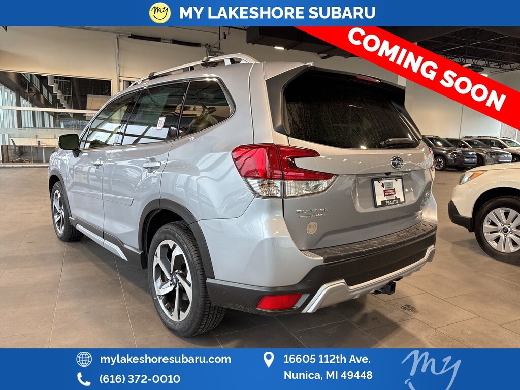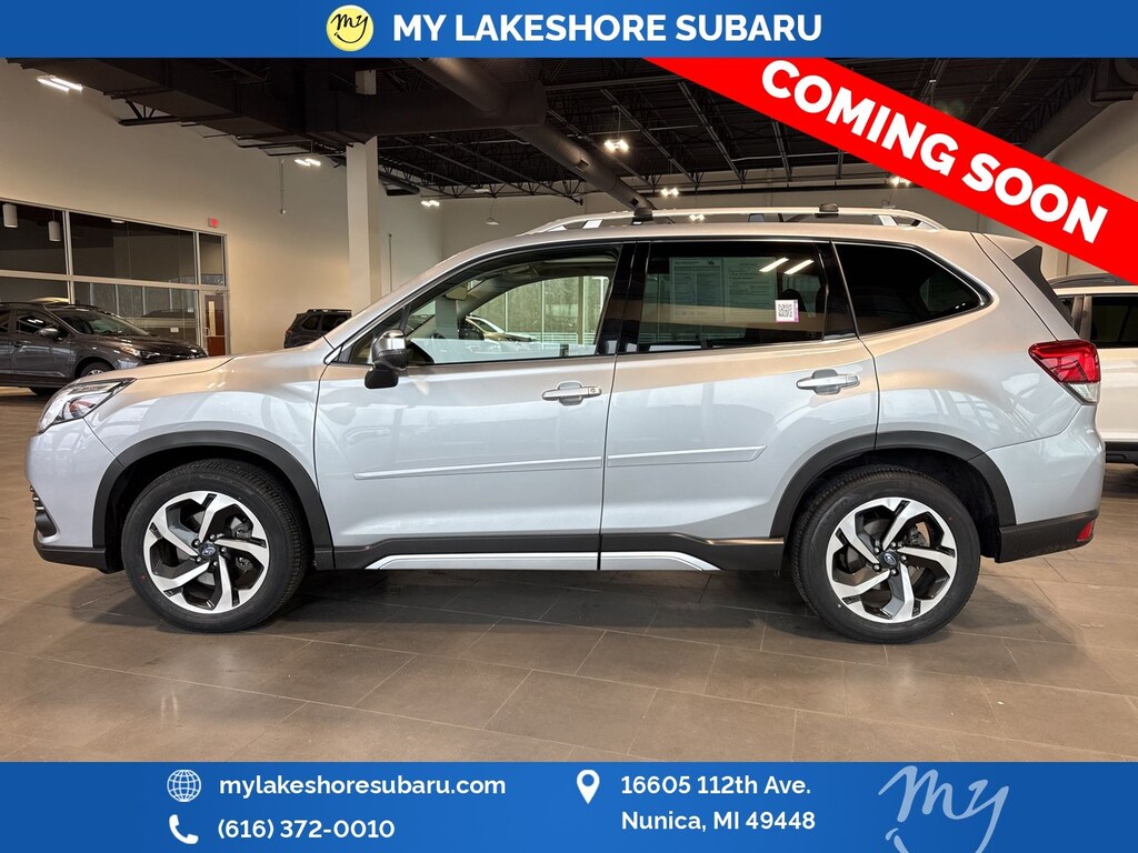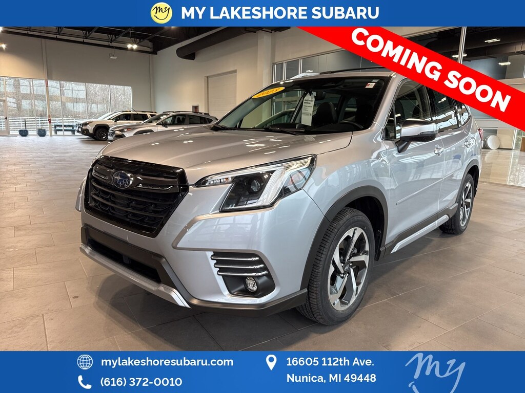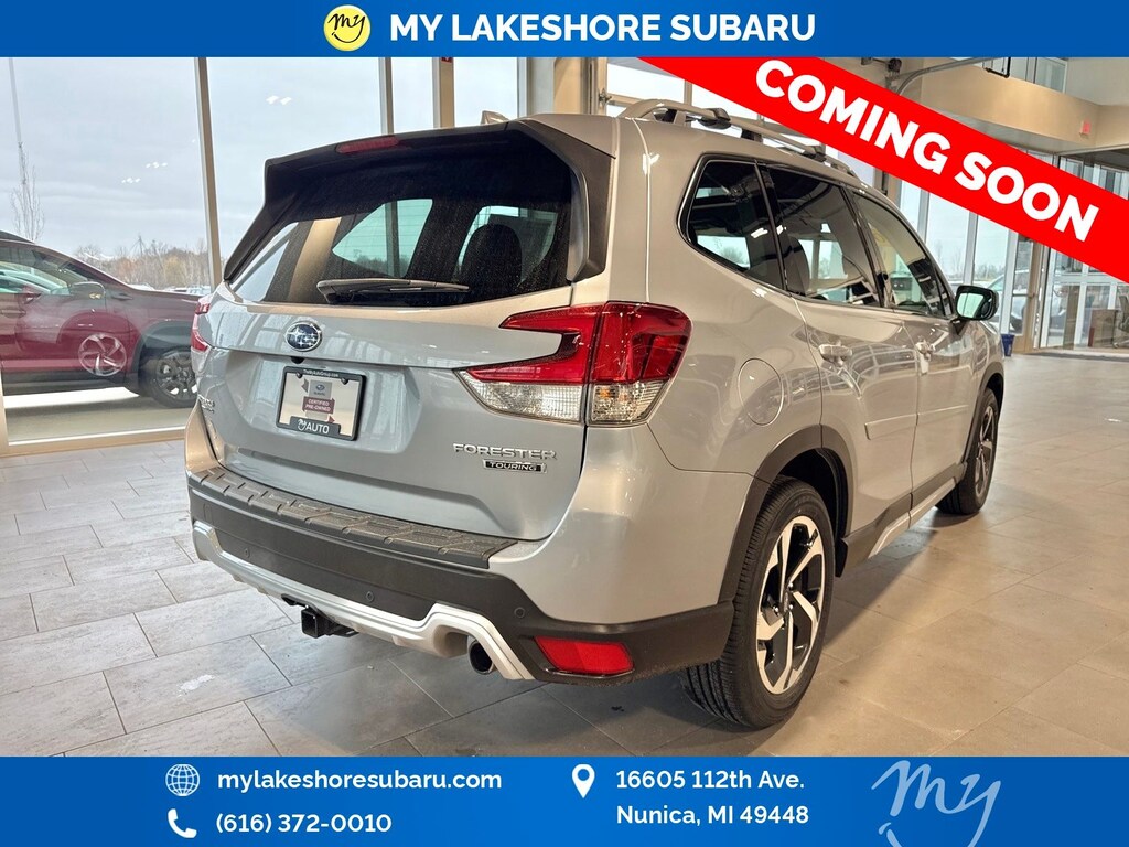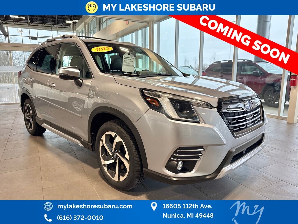 Forester Touring, Ice Silver Metallic, *ALL WHEEL DRIVE*, *APPLE CARPLAY & ANDROID AUTO*, *BACKUP CAMERA*, *BLIND SPOT ALERT*, *EYESIGHT Driver Assist*, *HEATED REAR Seats*, *HEATED STEERING WHEEL*, *LANE DEPARTURE WARNING*, *LEATHER HEATED POWER SEATS*, *LOCAL TRADE*, *OIL CHANGES for LIFE*, *PANORAMIC MOONROOF*, *PREMIUM SOUND*. Certified. Ice Silver Metallic 2023 Subaru Forester Touring AWD Lineartronic CVT 2.5L 4-Cylinder DOHC 16V