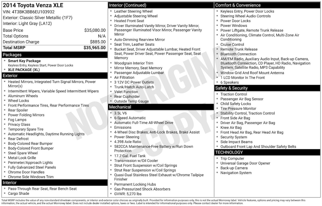 Venza XLE, AWD, Classic Silver Metallic, *ALL WHEEL DRIVE*, *LEATHER HEATED POWER SEATS*, *LOCAL TRADE*, ABS brakes, Air Conditioning, Alloy wheels, Automatic temperature control, Back-Up Camera, Compass, Electronic Stability Control, Front dual zone A/C, Heated door mirrors, Heated Front Bucket Seats, Heated front seats, Illuminated entry, Leather Seat Trim, Low tire pressure warning, Power Folding Outside Rear-View Mirrors, Power Liftgate, Rear window defroster, Remote keyless entry, Traction control. Classic Silver Metallic 2014 Toyota Venza XLE AWD 6-Speed Automatic Electronic with Overdrive 3.5L V6 SMPI DOHC