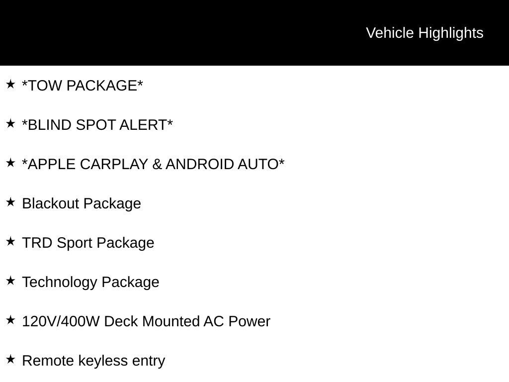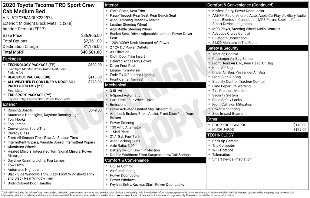 Tacoma TRD Sport V6, 4WD, Midnight Black Metallic, *APPLE CARPLAY & ANDROID AUTO*, *BLIND SPOT ALERT*, *TOW PACKAGE*, 120V/400W Deck Mounted AC Power, ABS brakes, Alloy wheels, Black Chrome Exhaust Tip, Black Tailgate Insert, Blackout Emblem Overlays, Blackout Package, Blind Spot Monitor w/Rear Cross Traffic Alert, Color-Keyed Overfenders, Electronic Stability Control, Engine Immobilizer, Heated door mirrors, Illuminated entry, Low tire pressure warning, Mesh Front Grille, Power Sliding Rear Window w/Privacy Glass, Rear Parking Assist Sonar, Remote keyless entry, Technology Package, Traction control, TRD Sport Package. Midnight Black Metallic 2020 Toyota Tacoma TRD Sport V6 4WD 6-Speed 3.5L V6 PDI DOHC 24V LEV3-ULEV70 278hp